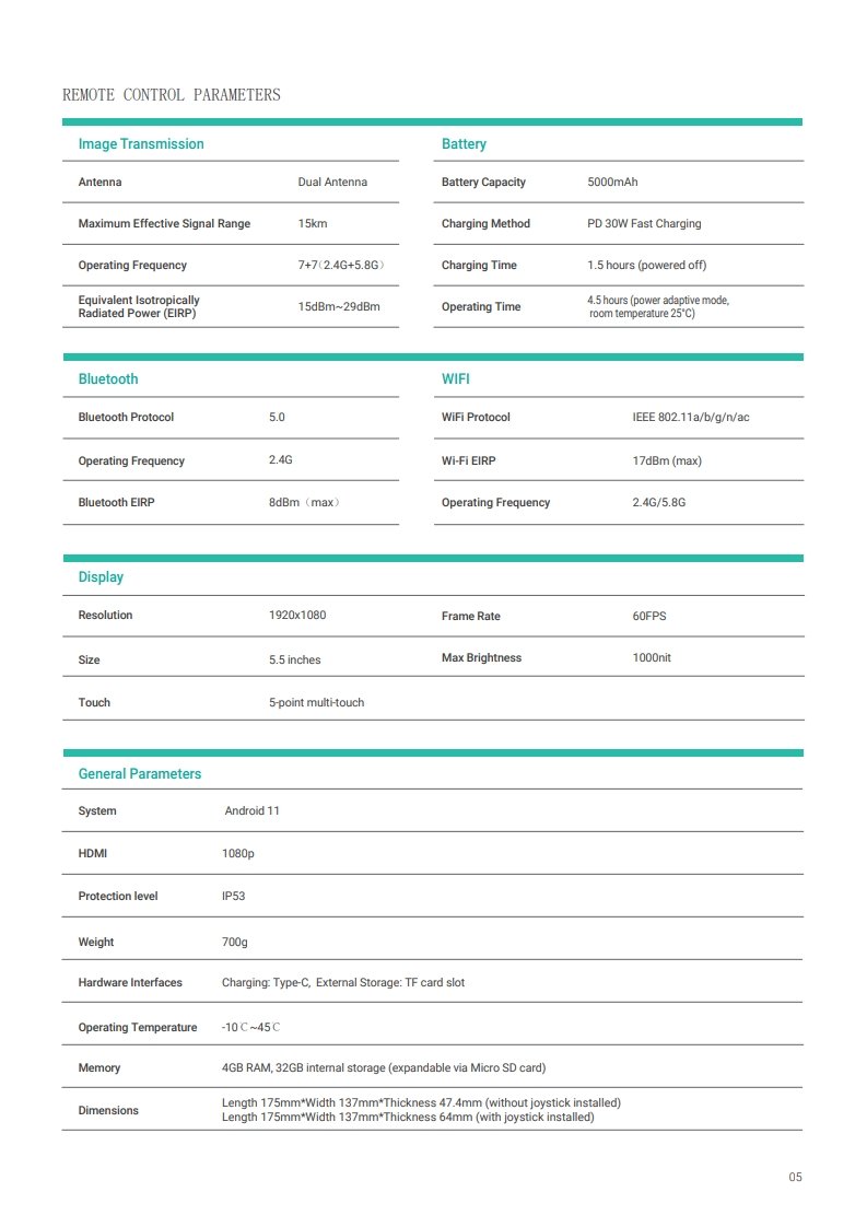 Comes with a professional remote controller with built-in display, providing a transmission range of 10–12.5 km with dual-band communication support.
